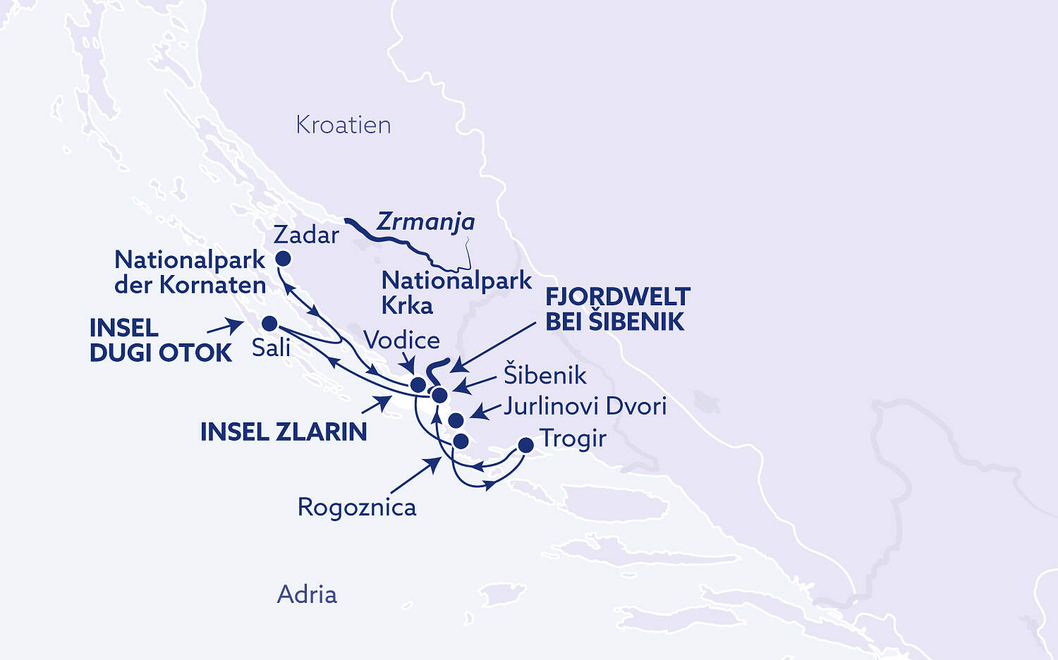 Erleben Sie eine außergewöhnliche Adria Kreuzfahrt entlang der dalmatinischen Küste an Bord unserer stilvollen MY Princess. Diese Dalmatien Kreuzfahrt mit kleinem Schiff verbindet entspanntes Reisen mit exklusiven Erlebnissen abseits großer Kreuzfahrtrouten. In acht Tagen entdecken Sie die schönsten Küstenabschnitte Norddalmatiens - geprägt von historischen Städten, geschützten Nationalparks und traumhaften Badebuchten mit kristallklarem Wasser. Dank der überschaubaren Schiffsgröße genießen Sie persönlichen Service, wunderschöne Häfen und einzigartige Ankerplätze, die großen Schiffen verborgen bleiben. Die Reise beginnt in der UNESCO-Weltkulturerbestadt Trogir, deren mittelalterliche Altstadt mit venezianischem Flair begeistert. In Šibenik erwarten Sie die beeindruckende Kathedrale des Heiligen Jakob sowie die spektakuläre Fjordlandschaft an der Krka-Mündung, ein Highlight jeder Kroatien Kreuzfahrt. Der Nationalpark Kornaten fasziniert mit seinem einzigartigen Inselarchipel aus rund 150 unberührten Inseln und zählt zu den eindrucksvollsten Naturlandschaften der Adria. In Sali erleben Sie das ruhige Inselleben Dalmatiens, während Zadar mit römischen Ruinen, lebendiger Altstadt und modernen Attraktionen wie der Meeresorgel einen spannenden Kontrast bietet. Küstenorte wie Vodice und Rogoznica runden diese Dalmatien Kreuzfahrt mit kleinem Schiff perfekt ab und laden zum Genießen, Baden und Flanieren ein.