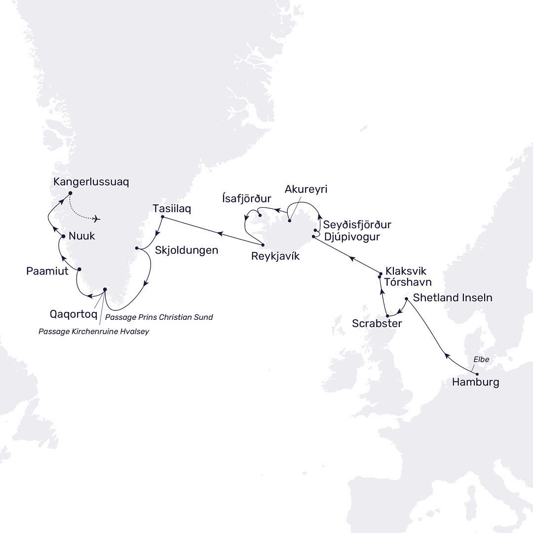 Der genaue Fahrplan in Grönland wird vom Kapitän festgelegt. Bei Eisgang im Prins Christian Sund wird alternativ das Kap Farvel gekreuzt.