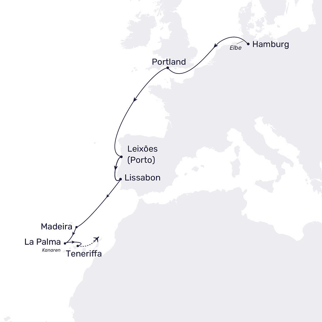 Im Winter erwartet Sie mit unserer beliebten MS Hamburg ab Hamburg eine vielfältige 11-tägigen Atlantikkreuzfahrt Richtung Süden. Freuen Sie sich auf entspannte Seetage, faszinierende Küstenstädte und traumhafte Inselwelten - von England über Portugal bis nach Madeira und auf die Kanaren. Diese Kreuzfahrt ab Hamburg verbindet Kultur, Natur und Erholung auf perfekte Weise. Ein Highlight: Der Rückflug von Teneriffa ist bereits inklusive - komfortabler kann Ihre Reise nicht enden! Nach einem erholsamen Tag auf See begrüßt Sie Portland an der Südküste Englands mit beeindruckenden Klippenlandschaften und maritimem Flair. Weiter geht es nach Leixões bei Porto, wo Sie durch die historische Altstadt schlendern, die berühmte Portwein-Tradition kennenlernen und den Blick über den Douro genießen können. In Lissabon, der charmanten Hauptstadt Portugals, erwarten Sie nostalgische Straßenbahnen, verwinkelte Gassen in Alfama und spektakuläre Aussichtspunkte über dem Tejo. Ein weiteres Highlight ist Madeira, die „Blumeninsel“ im Atlantik: Üppige Vegetation, spektakuläre Steilküsten und ganzjährig mildes Klima machen die Insel zu einem Paradies für Naturfreunde. Zum krönenden Abschluss erleben Sie die Kanaren mit La Palma, bekannt für ihre ursprüngliche Landschaft und klaren Sternenhimmel, sowie Teneriffa, wo sich beeindruckende Vulkanlandschaften rund um den Teide mit entspannten Strandmomenten verbinden.