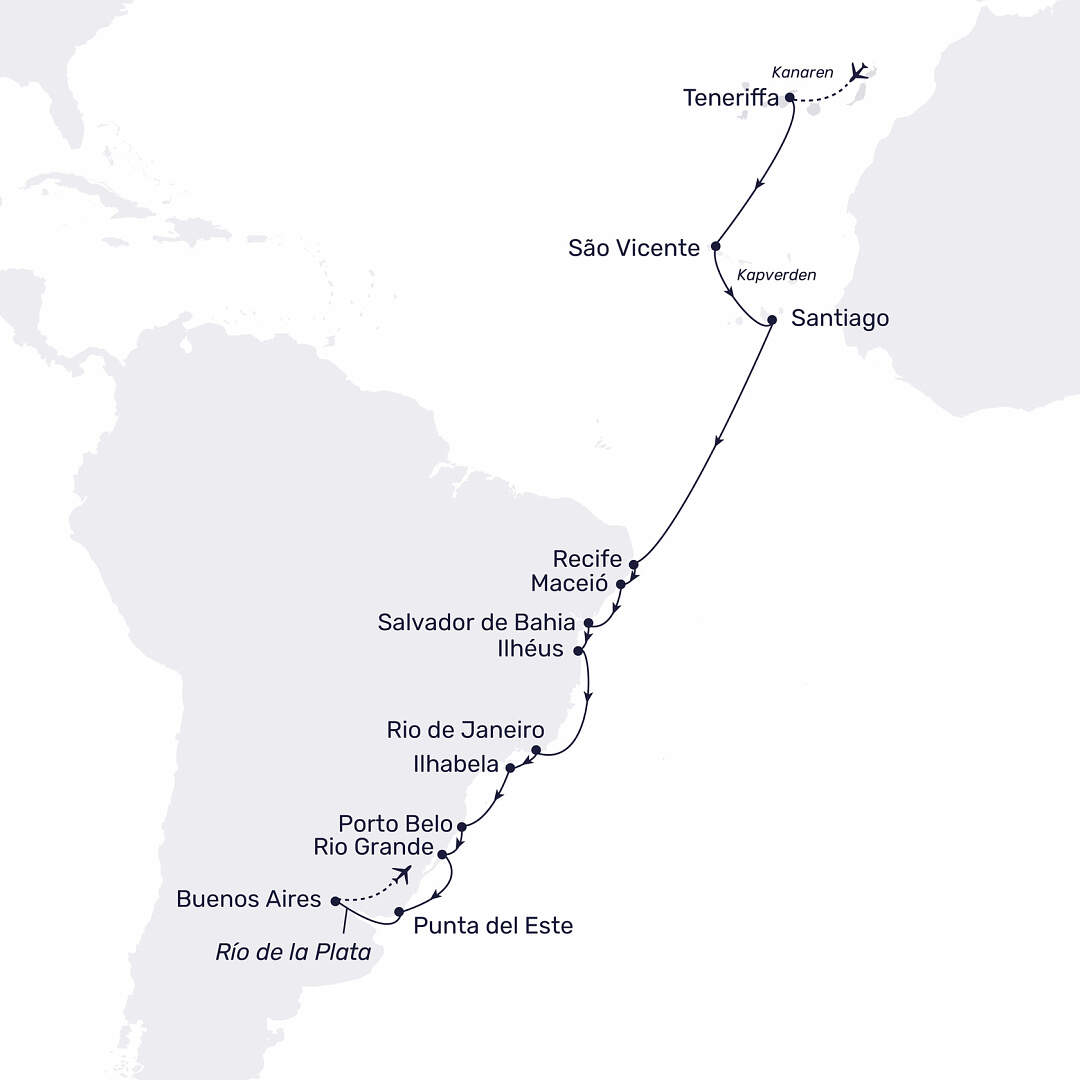 Hinweis Brasilien: Die brasilianischen Behörden untersagen innerbrasilianische Unterbrechungen der Kreuzfahrt (mehrtägige Überlandausflüge) mit Zwischenausstieg in einem brasilianischen Hafen und späterem Wiedereinstieg in einem anderen brasilianischen Hafen. Landausflüge in den einzelnen Häfen sind davon nicht betroffen.