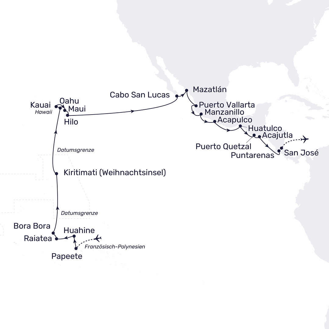 Willkommen zu einer traumhaften Südseekreuzfahrt mit der MS Hamburg. An Bord unserer komfortablen MS Hamburg erleben Sie eine außergewöhnliche Route von den Inselparadiesen Französisch-Polynesiens bis nach Mittelamerika. Das Beste: Die Flüge sind bereits inklusive! Ihre Kreuzfahrt beginnt in Papeete und führt Sie zu den schönsten Perlen von Französisch-Polynesien. Auf Huahine erwarten Sie üppige Natur und ursprüngliche Dörfer, Raiatea gilt als spirituelles Herz der Südsee, und Bora Bora verzaubert mit seiner legendären Lagune in schillernden Blau- und Smaragdtönen - ein Bilderbuchmotiv, das Sie nie vergessen werden. Mitten im endlosen Pazifik entdecken Sie das abgeschiedene Inselreich Kiribati, wo ursprüngliche Traditionen und paradiesische Strände ein authentisches Südseegefühl vermitteln. Weiter geht es nach Hawaii: Auf Oʻahu verschmelzen pulsierendes Inselleben und Traumstrände, Kauaʻi begeistert mit spektakulären Klippen und tropischer Vegetation, während Maui mit Vulkangipfeln und Panoramastraßen beeindruckt. Der Zauber des „Aloha Spirit“ begleitet Sie auf Schritt und Tritt. In Mexiko erwarten Sie sonnige Küsten und lateinamerikanische Lebensfreude: Cabo San Lucas fasziniert mit markanten Felsformationen, Puerto Vallarta mit kolonialem Charme und goldenen Stränden, und in Acapulco sorgen die berühmten Klippenspringer für Gänsehautmomente. In Guatemala und El Salvador erleben Sie eindrucksvolle Vulkanlandschaften und kulturelle Schätze, bevor Ihre Reise im grünen Naturparadies von Puntarenas in Costa Rica ihren krönenden Abschluss findet. Diese Kreuzfahrt verbindet die Südsee, Hawaii und Mittelamerika zu einer einzigartigen Kombination aus Trauminseln, Vulkanwelten und kulturellen Höhepunkten. Freuen Sie sich auf intensive Naturerlebnisse, entspannte Seetage und unvergessliche Momente.
