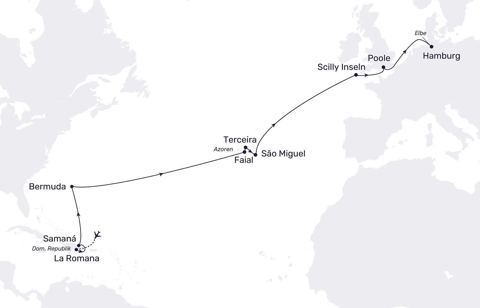 Erleben Sie eine unvergessliche 21-tägige Transatlantik Kreuzfahrt mit unserer deutschsprachigen MS Hamburg von La Romana in der Dominikanische Republik bis nach Hamburg - eine Traumreise zwischen Karibik, Atlantik und Europa. Freuen Sie sich auf entspannte Seetage mit erstklassigem Service, viel Raum für Erholung und echter Kreuzfahrtatmosphäre an Bord. Ein erster Höhepunkt erwartet Sie in Hamilton auf den Bermudas: Pastellfarbene Häuser, britisch-karibisches Flair und rosafarbene Sandstrände machen den Besuch zu etwas ganz Besonderem. Weiter geht es zu den faszinierenden Azoren mit den Inseln Faial, Terceira und São Miguel - bekannt für spektakuläre Vulkanlandschaften, smaragdgrüne Kraterseen und charmante Hafenorte. Naturfreunde erleben hier Europas wilde Atlantikseite in ihrer ursprünglichsten Form. Zum krönenden Abschluss führen Sie die idyllischen Scilly-Inseln und das elegante Küstenstädtchen Poole in England zurück nach Norddeutschland. Diese außergewöhnliche Atlantik Kreuzfahrt verbindet karibische Leichtigkeit, beeindruckende Naturwunder und britische Küstenromantik. Der Hinflug ist übrigens für Sie bereits inbegriffen.