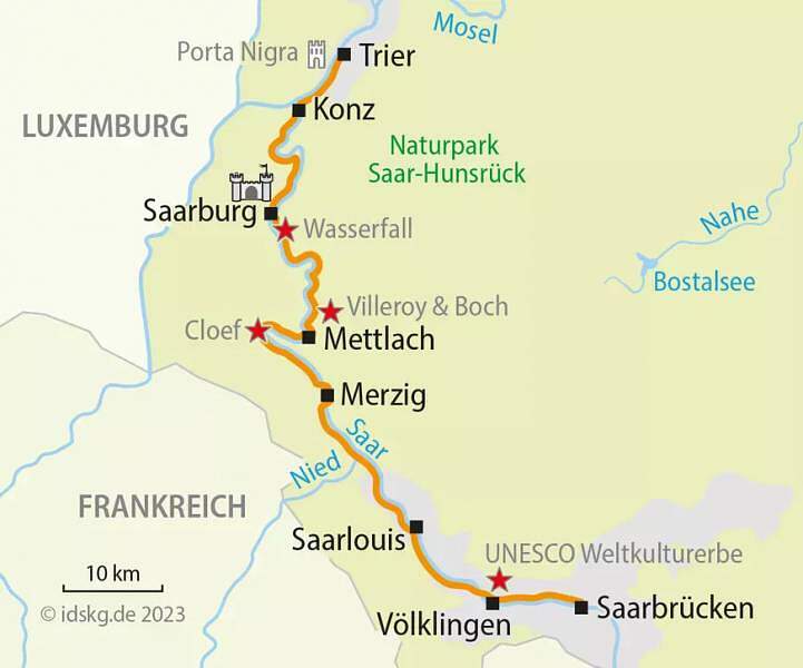 Auf dieser 5-tägigen Radreise, die fast immer einen ebenen Verlauf hat, radeln Sie genussvoll von Saarbrücken bis Trier. Und das meist direkt am Flussufer der Saar entlang und die Radwege sind hervorragend beschildert. In gemütlichen Tagesetappen geht es von der Landeshauptstadt des Saarlands - von Saarbrücken - bis zur Mündung der Saar in die Mosel. Besuchen Sie das Weltkulturerbe Völklinger Hütte, lassen Sie den Blick über die eindrucksvolle Saarschleife schweifen, oder statten Sie dem Erlebniszentrum von Villeroy & Boch in Mettlach einen Besuch ab. Eine Rückreise nach Saarbrücken kann dazu gebucht werden.