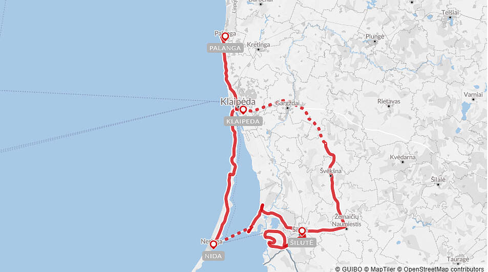 Streckeninformation: Die Radtouren führen vorwiegend auf verkehrsarmen Nebenstraßen, auf den hochwertigen Radwegen des Litauischen Küstenradwegs und auch Schotterwegen. Das Gelände ist flach, nur auf der Kurischen Nehrung sind ein paar kurze Steigungen zu bewältigen.