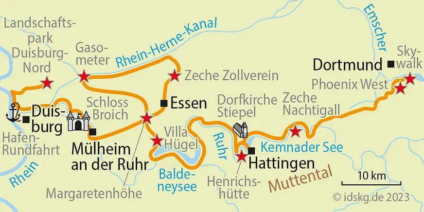 Die Etappen zwischen Dortmund, Hattingen, Essen und Duisburg sind moderat und meist gut ausgebaut. Wer gerne entspannt radelt und Wert auf eine komfortable, geführte Tour mit Reiseleitung legt, wird sich hier wohlfühlen.