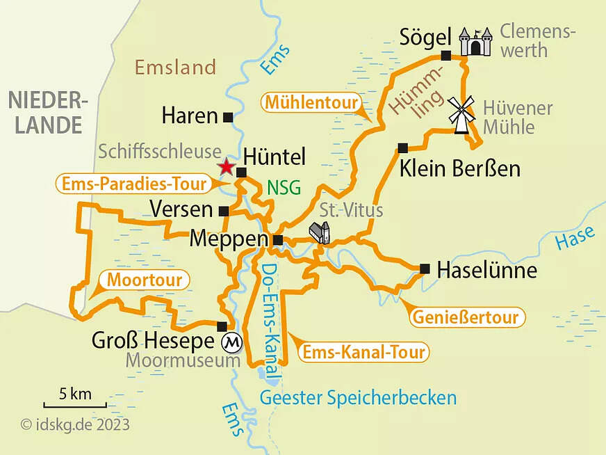 Die Sternradtour im Emsland rund um Meppen ist eine ideal geeignete Radreise für alle, die das Radfahren in ruhigem Tempo mit Natur- und Kulturerlebnissen verbinden möchten. Die flache Landschaft, gut ausgebaute Radwege und überschaubare Tagesetappen machen die Tour besonders attraktiv für Genussradler, Paare, Familien mit etwas Raderfahrung sowie für ältere Reisende oder E-Bike-Nutzer. Durch die abwechslungsreichen Ausflüge - von Moorlandschaften über idyllische Emsauen bis hin zu historischen Orten wie der Hüvener Mühle und Schloss Clemenswerth - bietet jede Etappe neue Eindrücke, ohne zu überfordern.