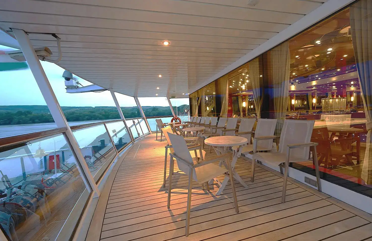 Bequeme Deck- und Liegestühle in ausreichender Anzahl stehen Ihnen auf dem Sonnendeck zur freien Verfügung. Genießen Sie die Fahrt auf dem Schiff und lassen Sie die Seele baumeln. Wir möchten Sie jedoch bitten, keine Liegen oder Stühle im Voraus zu reservieren. Andernfalls ist das Personal angewiesen, liegen gelassene Gegenstände von „herrenlosen“ Stühlen zu entfernen, die Sie dann an der Rezeption wieder abholen können.