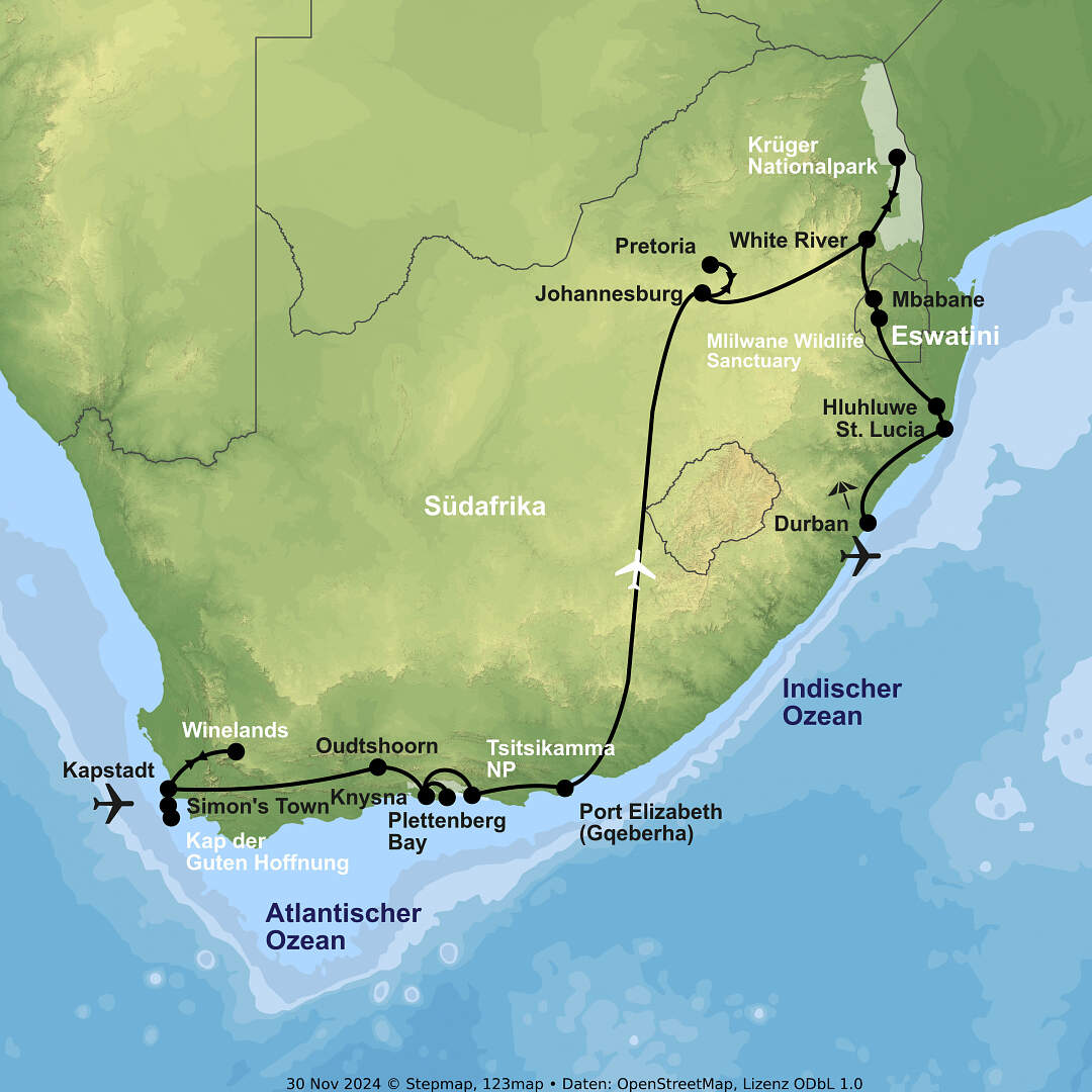 Südafrika - ein Land voller Farben und Überraschungen erwartet Sie auf dieser Rundreise. Es ist eine Reise zu den Höhepunkten des Landes zwischen Gardenroute und Krüger Nationalpark. Ihre Rundreise beginnt im wundervollen Kapstadt, das vom berühmten Tafelberg überragt wird. Besuchen Sie das eindrucksvolle Kap der guten Hoffnung und auch Südafrikas Weinanbaugebiete sollten nicht fehlen. Über die Gardenroute, die sich vom Westkap bis zum Ostkap - von Mossel Bay bis Port Elizabeth - erstreckt, reisen Sie nach Port Elizabeth. Lassen Sie den Blick über den Indischen Ozean schweifen. Per Flug geht es dann nach Johannesburg und von dort in den Krüger Nationalpark. Halten Sie Ausschau nach den sogenannten "Big Five.