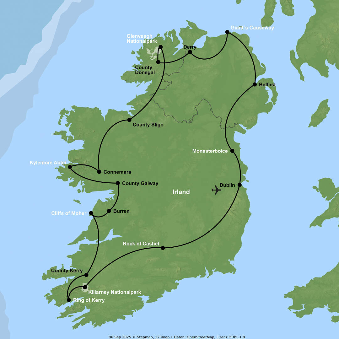 Erleben Sie auf dieser Rundreise nicht nur Irland die "Grüne Insel" sondern auch das britische Nordirland. Große Seen, schroffe, Klippen und eine schier endlose Küste prägen die Landschaft Irlands. Lauschen Sie den Klängen der Bodhran, einer typischen irischen Trommel, genießen Sie einen Abend in einem urigen Pub bei einem Glas Guinness und besuchen Sie Reisehighlights wie den Giant's Causeway, die Klippen von Moher und die beiden Metropolen Belfast und Dublin. Irland erwartet Sie mit allen Sinnen und in allen Facetten. Herzlich Willkommen auf dieser wunderbaren Irland Rundreise!