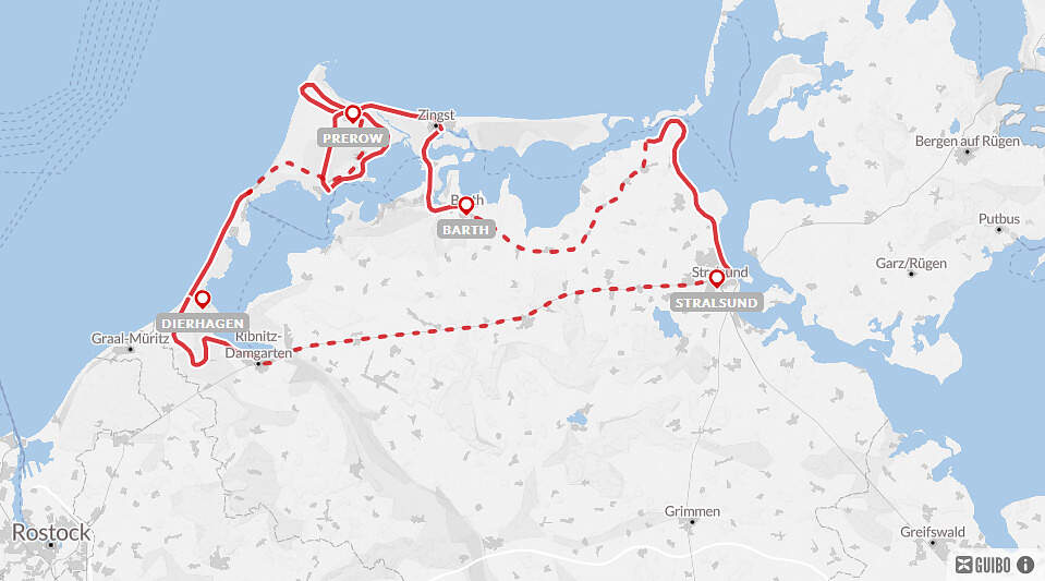 Am Morgen per Bahn nach Ribnitz-Damgarten. Vor Beginn Ihrer Wanderung sollten Sie das Bernstein Museum im ehemaligen Katharinenkloster besuchen. In Klockenhagen empfiehlt sich ein Besuch des Freilichtmuseums, bevor Sie zu den wunderschönen Fischländer Stränden im Ostseebad Dierhagen kommen.