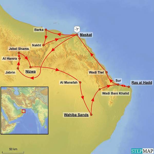 Das Sultanat Oman ist eines der letzten Paradiese aus 1001 Nacht. Es ist der Ausgangspunkt der sagenhaften Weihrauchstraße, die Heimat der Heiligen drei Könige und das Land von Sindbad dem Seefahrer. Während dieser einwöchigen Rundreise lernen Sie ein faszinierendes Land kennen - mit zerklüftetem Hochgebirge und tiefen Canyons, mit malerischen Oasen und wunderschönen Küsten und dazu eine schier endlose Wüste. Erleben Sie den Orient von seinen seiner Seiten: zwischen mystischer Ursprünglichkeit und modernem Lebensstil. Sie reisen in einer Gruppe mit maximal 24 Personen.
