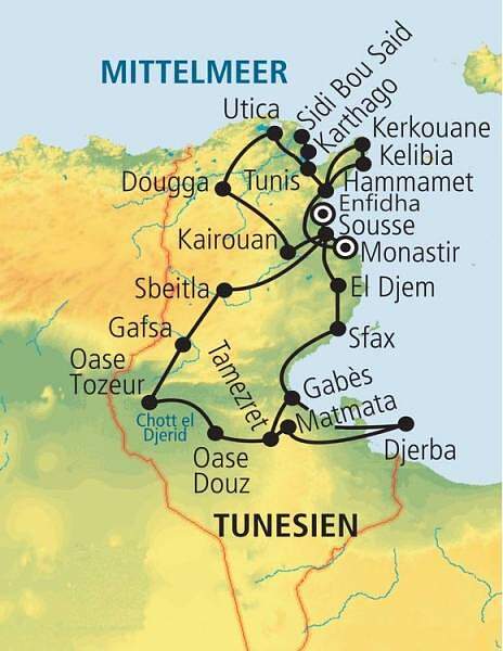 Erleben Sie auf dieser großen zweiwöchigen Rundreise durch Tunesien die kulturellen und landschaftlichen Höhepunkte des Landes. Spüren Sie dabei den Hauch des Orients und bestaunen Sie eine traditionelle Architektur. Die Geschichte Tunesiens ist lang. Bereits die Phönizier errichteten hier ihre erste Handelsniederlassung: Karthago. Und durch Alexander dem Großen wurde es zu einer wichtigen Handels- und Seemacht. Das Landschaftsbild wird von den Ausläufern des Atlasgebirges, endloser Wüsten und Oasen geprägt. Herzlich Willkommen in Tunesien auf dieser großen Rundreise!