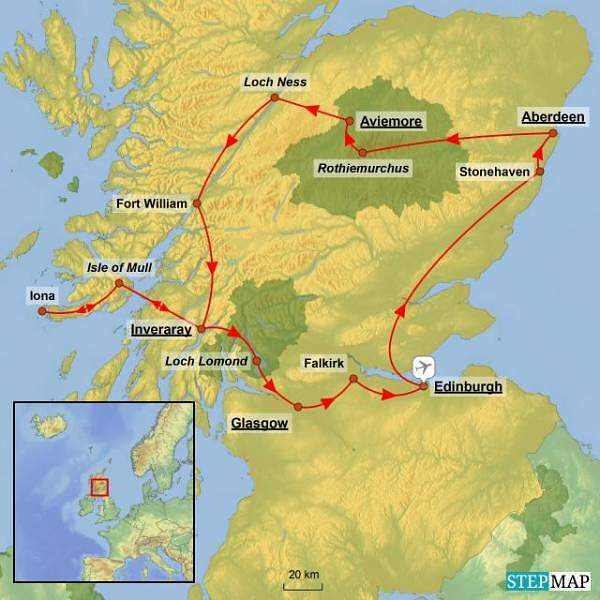 Schottland - damit verbindet man: die berühmten Highlands, den prächtigen Schottenrock und natürlich den Dudelsack! Nicht zu vergessen natürlich den schottischen Whisky, der weltberühmt ist. Ein Besuch einer Whisky Destillerie ist natürlich Pflicht! Aber Schottland ist noch viel mehr! Auf dieser Rundreise durch Schottland erhalten Sie einen umfassenden Einblick in die Kultur und Natur. Freuen Sie sich auf eine atemberaubende Landschaft, auf romantische Gärten, glasklare Seen, alte, trutzige Burgen und Schlösser. Auf dieser Schottland Rundreise besuchen Sie zudem Städte wie Edinburgh und Glasgow und unternehmen eine Fahrt zur Isle of Mull und Iona.