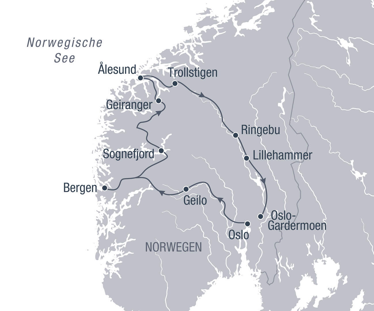 Willkommen in Norwegen! Entdecken Sie Norwegens Naturschönheiten: den Geiranger-, Sognefjord, die Passstraße Trollstigen, Gletscher und Wasserfälle. Entdecken Sie die norwegische Hauptstadt Oslo auf einer Stadtrundfahrt, unternehmen Sie eine Fjordkreuzfahrt auf dem Geirangerfjord von Geiranger nach Hellesylt und genießen Sie eine atemberaubende Fahrt über den Trollstigen - über die berühmte Passstraße. Sie erleben Norwegen in seiner schönsten Form auf dieser Rundreise!