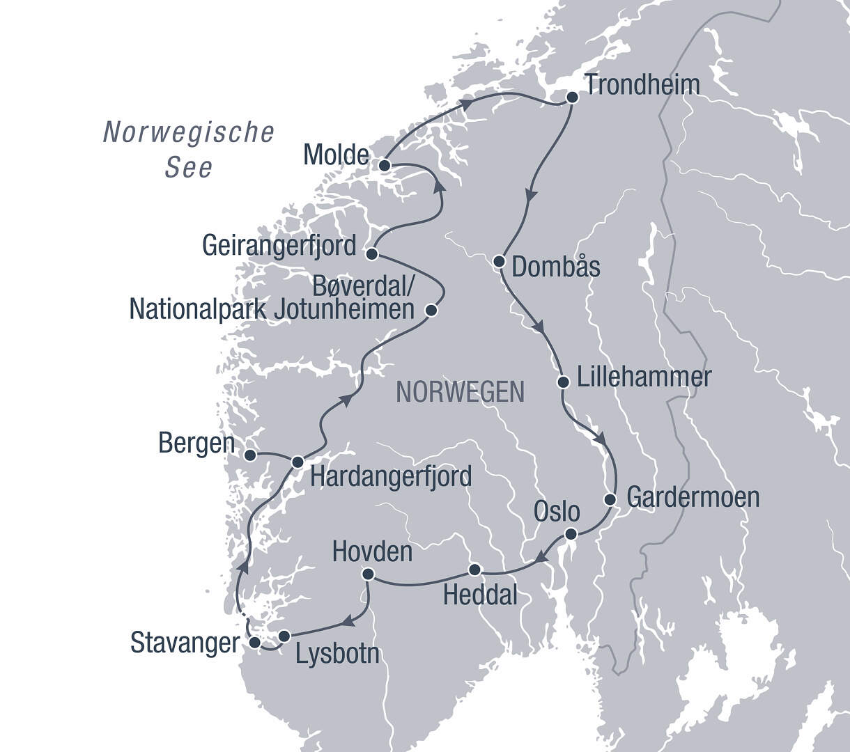 Lernen Sie Norwegens einzigartige Natur auf dieser wunderschönen 11-tägigen Busrundreise mit deutschsprechender Reiseleitung kennen. Telemark, Stavanger, Bergen, Molde, Lillehammer sowie die Atlantische Straße sind nur einige Stationen während dieser Norwegenrundreise. Auch unternehmen Sie eine Bootsfahrt auf dem berühmten Geirangerfjord. In Oslo nehmen Sie an einer Stadtführung teil, und können so gut einen Einblick in die norwegische Hauptstadt beklommen. Herzlich Willkommen in Norwegen auf dieser unverwechselbaren Rundreise.