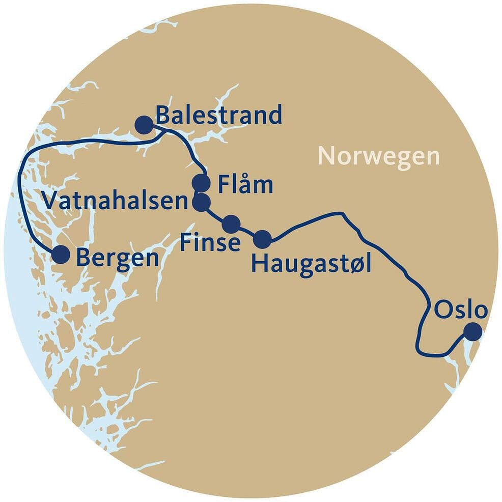 Erkunden Sie Norwegen, genauer gesagt Fjordnorwegen doch einmal als - als Bahn-Wanderreise. Bahn-Wandern ermöglich Ihnen eine ganz besondere Art des Reisens. Entschleunigen Sie vom Alltag, nehmen Sie am Wegesrand besondere Eindrücke wahr und bestimmen Sie Ihr eigenes Tempo. Sie wohnen während dieser Norwegen Reise in ausgesuchten Mittelklassehotels und die Bahnfahrten sind bereits im Reisepreis eingeschlossen. Wie die Bahnstrecke mit der Bergebahn. Auch sind natürlich Fahrten mit dem Expressboot von Flåm nach Balestrand und von Balestrand nach Bergen inkludiert. Erleben Sie Norwegen auf die sanfte Tour: Sie sind unterwegs mit Bahn und Boot - entlang einer der schönsten Eisenbahnstrecken Skandinaviens. Willkommen in Fjordnorwegen auf dieser Bahnwanderreise, die übrigens bereits im Kiel startet und Sie von dort ganz bequem mit der Color Line nach Oslo bringt.