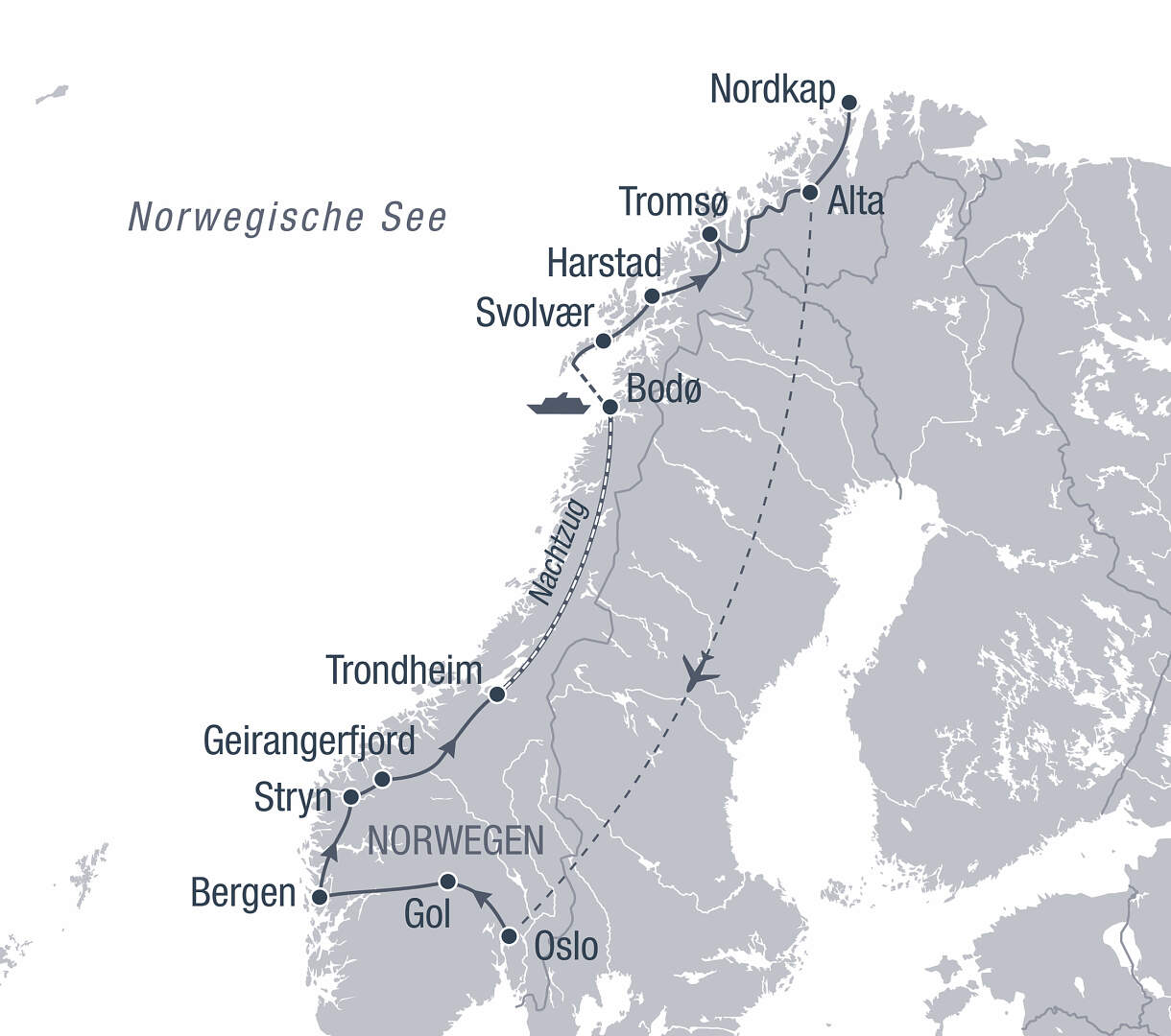 Diese erlebnisreiche 11-tägige Busrundreise durch Norwegen führt Sie mit deutschsprechender Reiseleitung bis hinauf zum Nordkap. Die Reise führt Sie durch norwegisch Lappland und die traumhafte Inselwelt der Lofoten. Sie starten in Oslo und fahren zunächst nach Geilo und Bergen, bevor Sie die herrlichen Fjorde Norwegens erkunden. Reisehighlight ist dann sicherlich das Nordkap! Vom Nordkapfelsen können Sie bei schönem Wetter das Naturschauspiel der Mitternachtssonne erleben. Über Alta geht es schließlich wieder zurück nach Oslo.