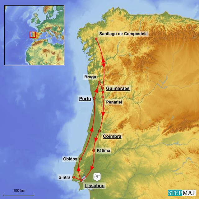 Diese interessante Rundreise zeigt Ihnen gleich zwei Länder: Portugal und einen kleinen Teil Spaniens. Auf dieser Portugal Rundreise sehen Sie die kulturellen Höhepunkte und erleben die landschaftliche Schönheit Portugals. Ein Abstecher führt Sie in das nordspanische Galizien mit der Pilgerstadt Santiago de Compostela - Inbegriff des berühmten Jakobswegs. Ihre Rundreise startet in der faszinierden Hauptstadt Lissabon und führt Sie bis in den Norden Portugals - bis nach Porto mit der malerischen Altstadt an der Douro-Mündung. Ihre Reiseroute führt Sie über die historische Universitätsstadt Coimbra, die mondänen Badeorte der Costa da Caparica und nach Guimarães, der "Wiege der Nation". Erleben Sie bei der Rundreise die Vielfalt des Landes und lassen Sie sich vom Charme Portugals verzaubern!