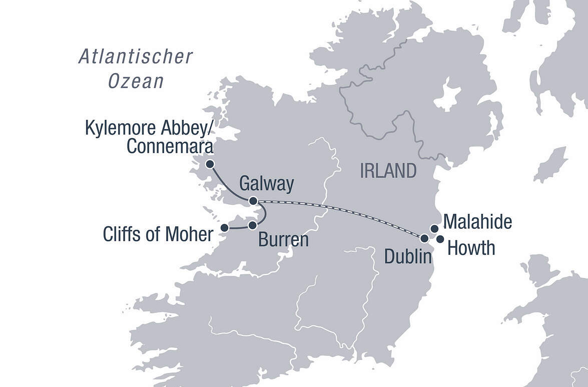 Erleben Sie Irland ganz entspannt und individuell auf einer 9-tägigen Rundreise mit dem Zug. Starten Sie Ihr Abenteuer in Dublin, der lebendigen Hauptstadt, wo Geschichte, Kultur und Lebensfreude aufeinandertreffen. Mit einer Hop-on-Hop-off-Stadtrundfahrt erkunden Sie die bekanntesten Sehenswürdigkeiten, bevor Sie mit dem Zug in Richtung Westen nach Galway aufbrechen - die charmante Hafenstadt, die für ihre Musik, Gastfreundschaft und farbenfrohe Altstadt bekannt ist. Von Galway aus erwarten Sie unvergessliche Tagesausflüge: Entdecken Sie die wilde Schönheit der Region Connemara, bestaunen Sie die atemberaubenden Cliffs of Moher und die faszinierende Karstlandschaft des Burren, und setzen Sie mit der Fähre über zu den traditionsreichen Aran Islands, wo Irlands Ursprünglichkeit bis heute spürbar ist. Diese Reise verbindet landschaftliche Highlights, kulturelle Vielfalt und komfortables Reisen auf Schienen - perfekt für alle, die Irland auf eigene Faust, aber mit sorgfältig geplanten Etappen erleben möchten.